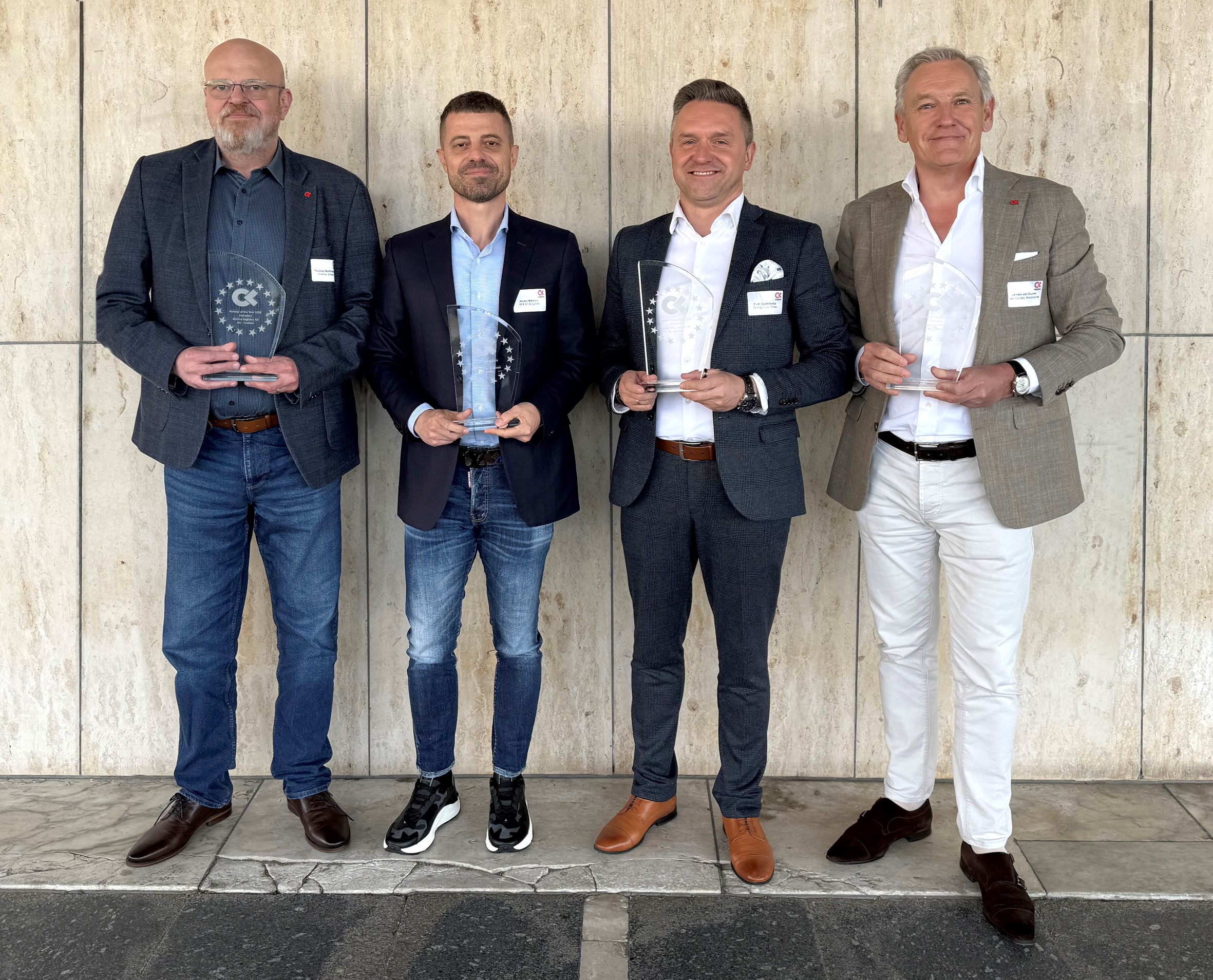 Bildunterschrift (v.l.n.r.): Thomas Werthmüller, Standortleiter beim Zweitplatzierten Rhenus (Schweiz), Hristo Marinov, Deputy CEO des Qualitätssiegers M&M Militzer & Münch (Bulgarien), Piotr Szalkiewicz, European Road Network Director beim Spitzenreiter Rohlig SUUS (Polen), und Jeroen van Duuren, Inhaber und Geschäftsführer des gleichnamigen drittplatzierten Unternehmens, zeigen nach der Auszeichnung als „Internationale CargoLine-Partner des Jahres 2024“ stolz ihre Pokale.